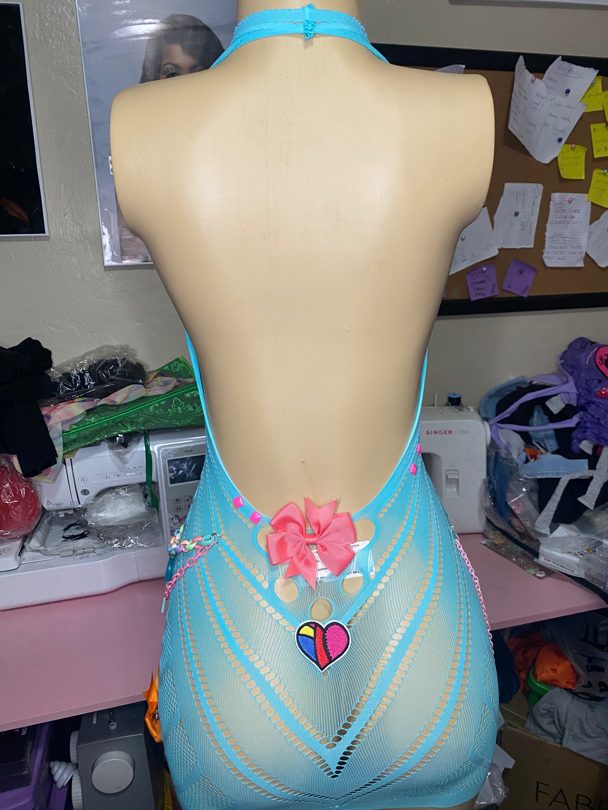 this is a custom colored dress. one size fits all fishnet dress with junk items on it.