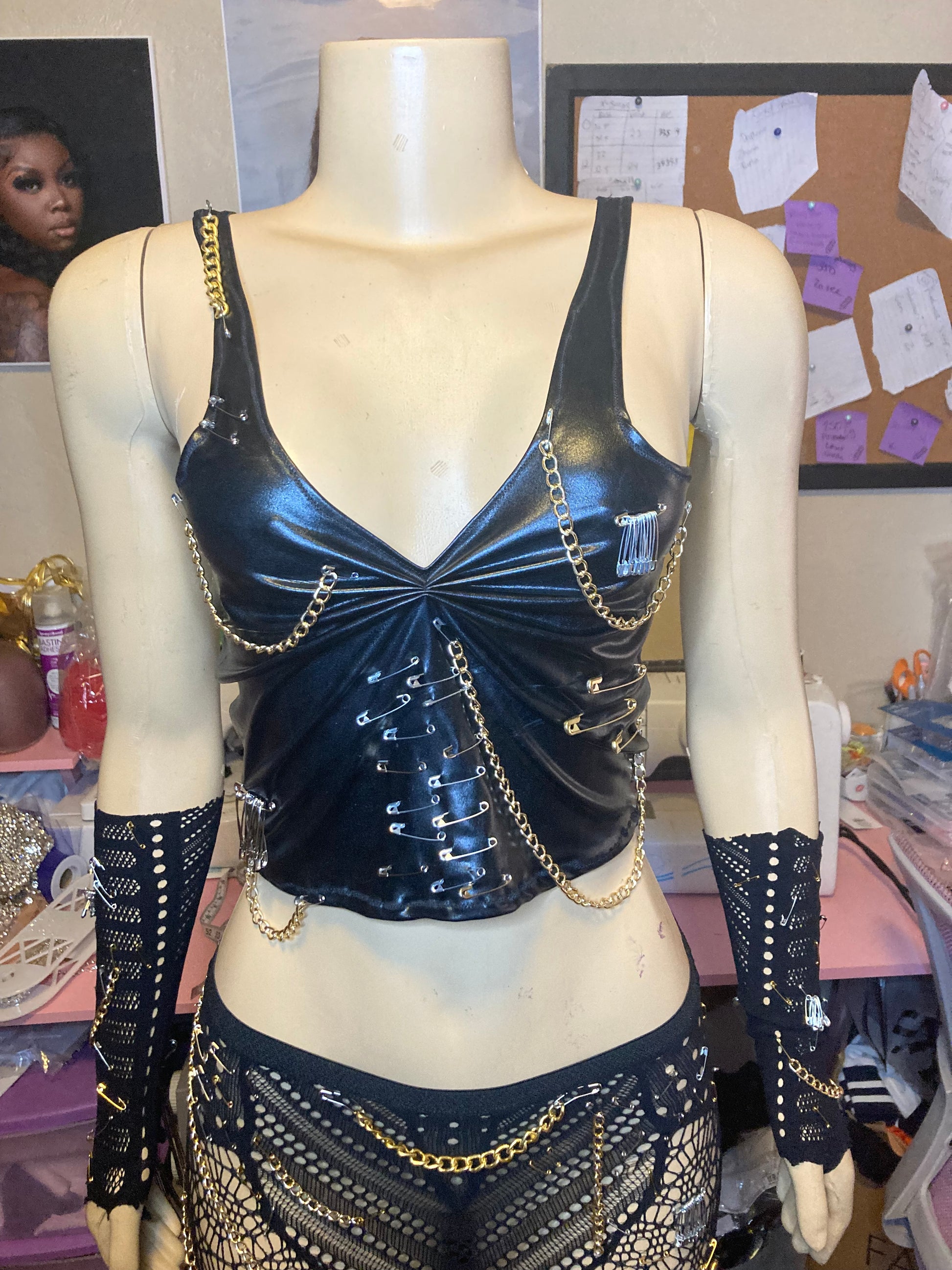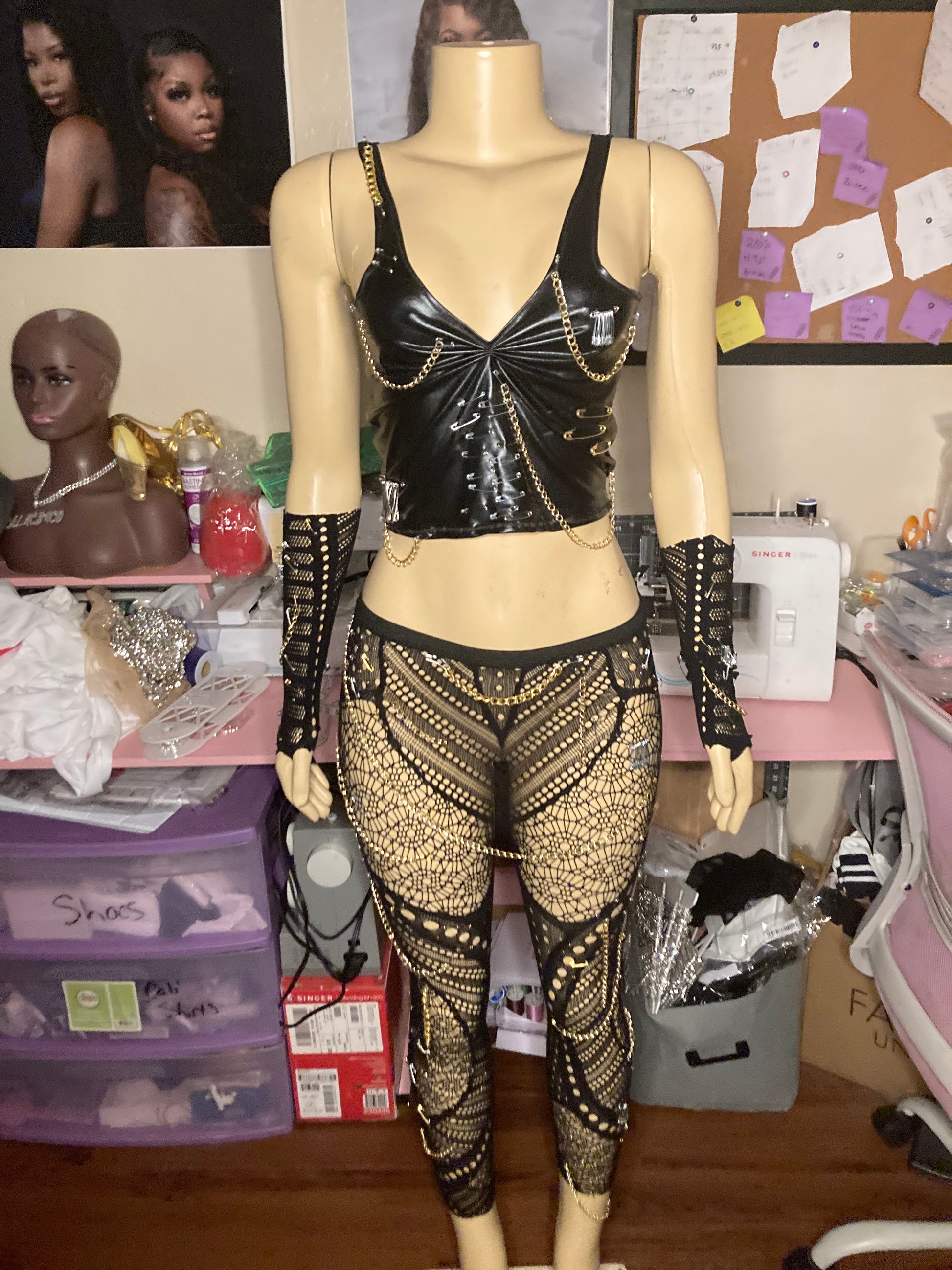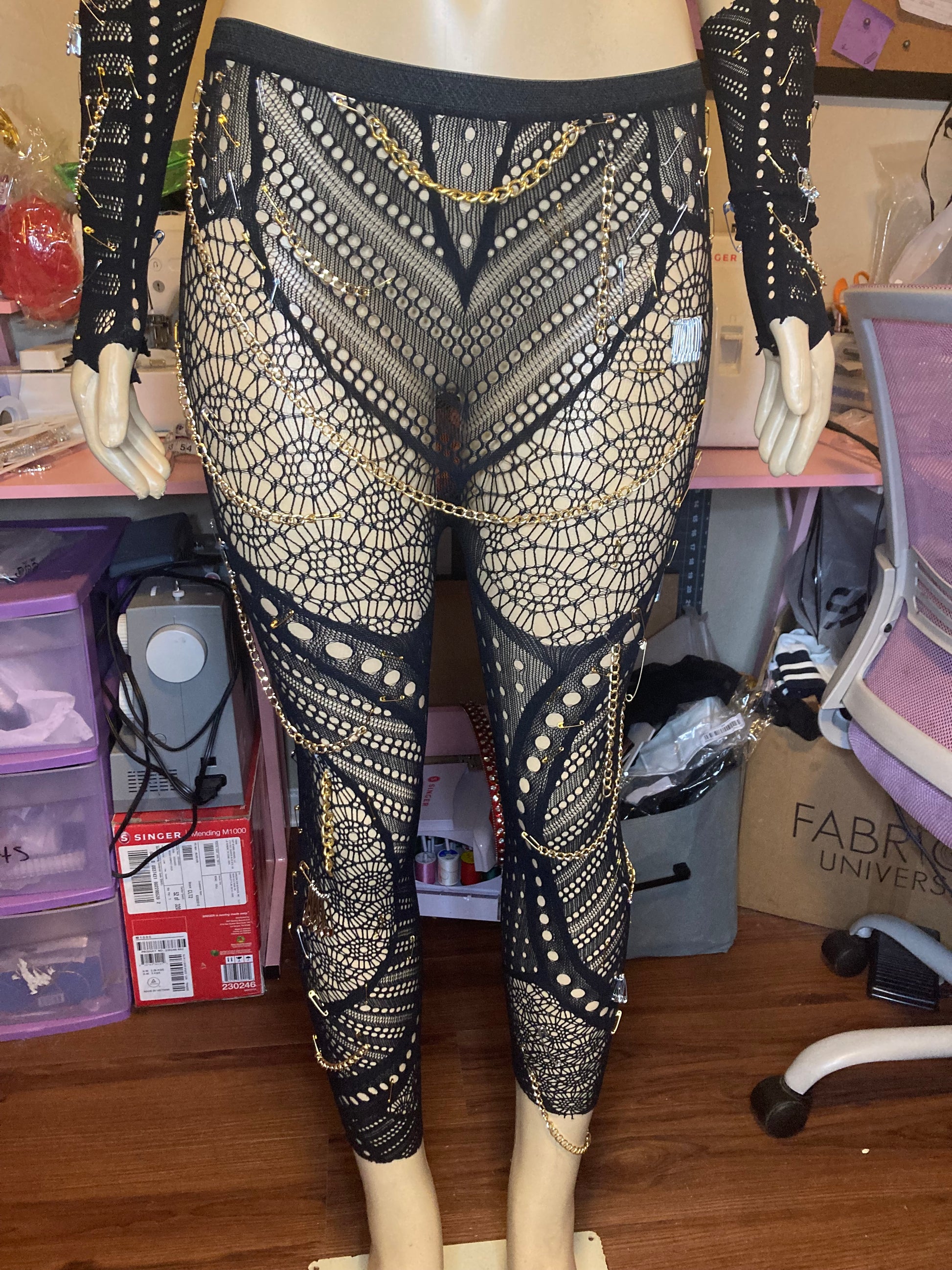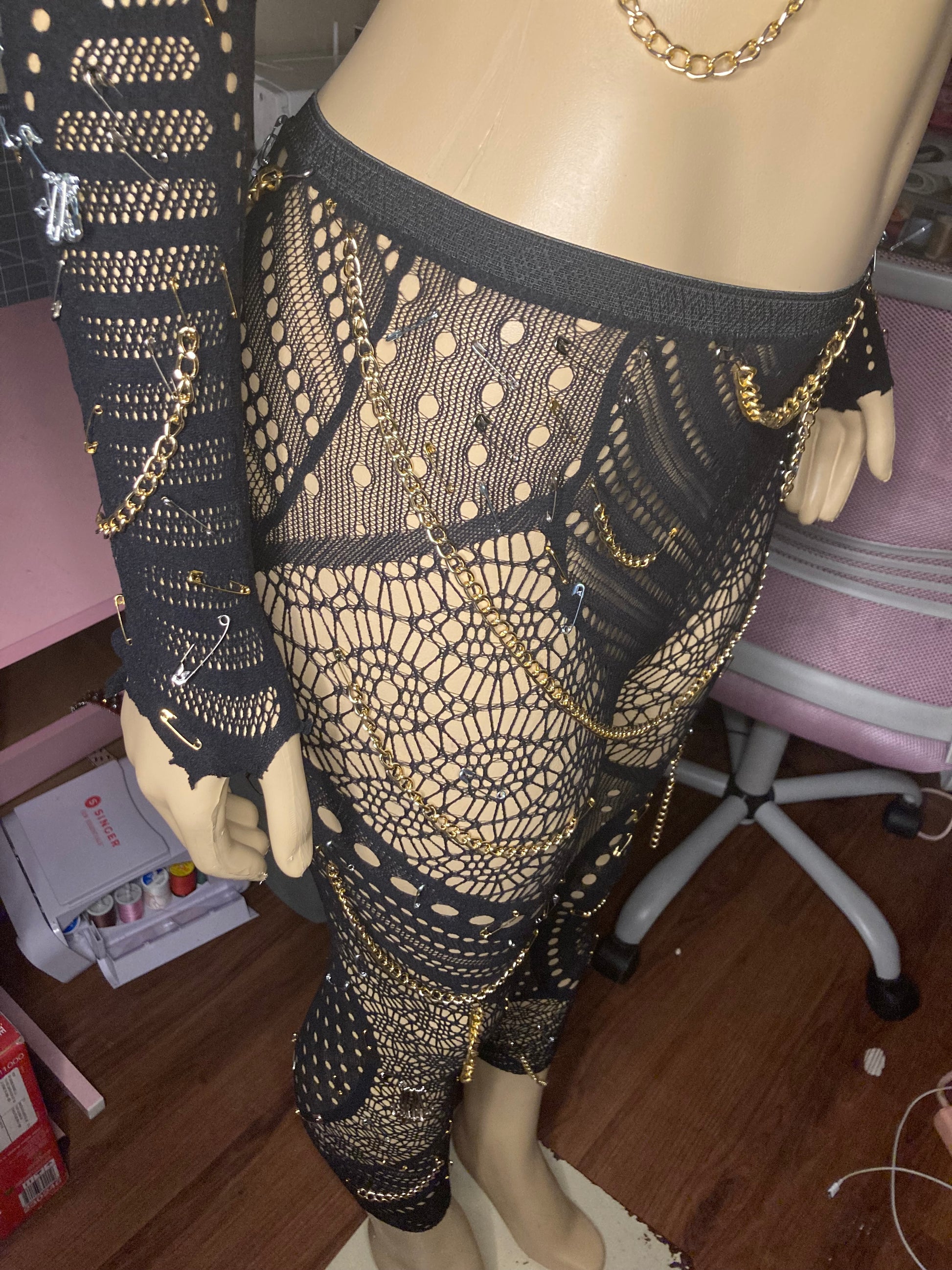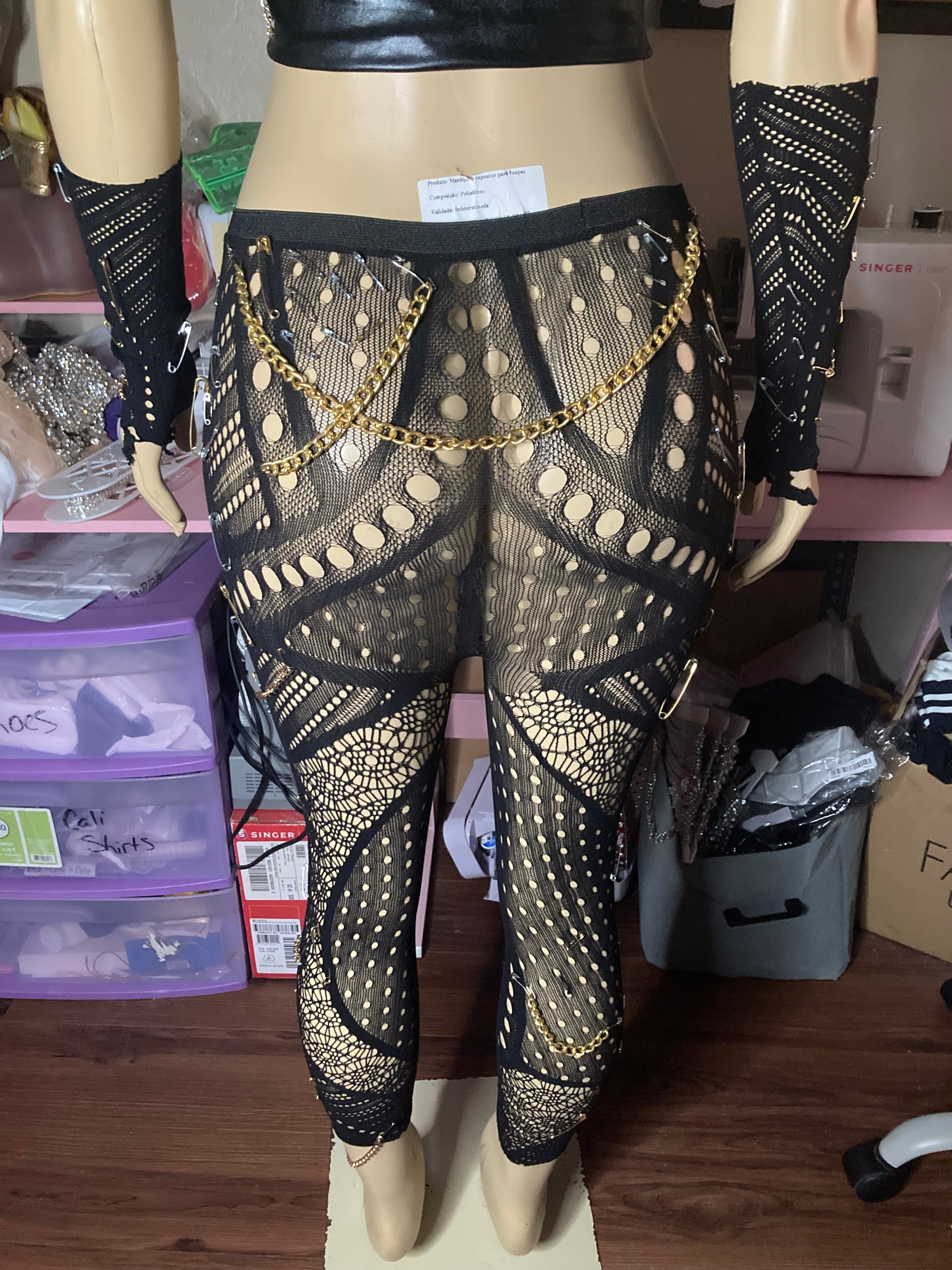 One size fits all leggings, your top will be the only thing you choose a size for. safety pins and chains placed all over outfit. with arm sleeves.